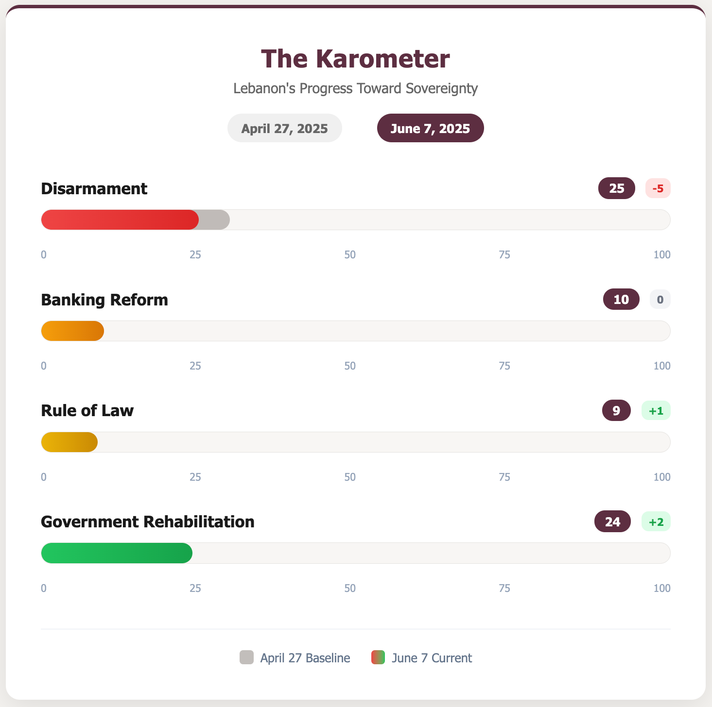 When we left off in April, disarmament had earned 30 points based on genuine LAF (the Lebanese Army - Lebanese Armed Forces) progress south of the Litani and open political discourse about militia weapons. Real progress had been made, and the taboo around discussing Hezbollah's arsenal was finally broken.